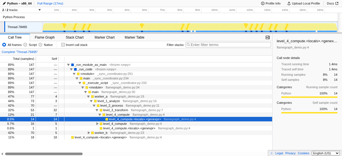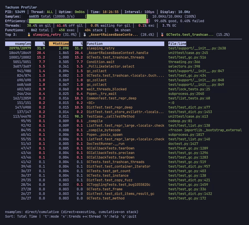 profiling of Python programs through periodic stack sampling. Tachyon can